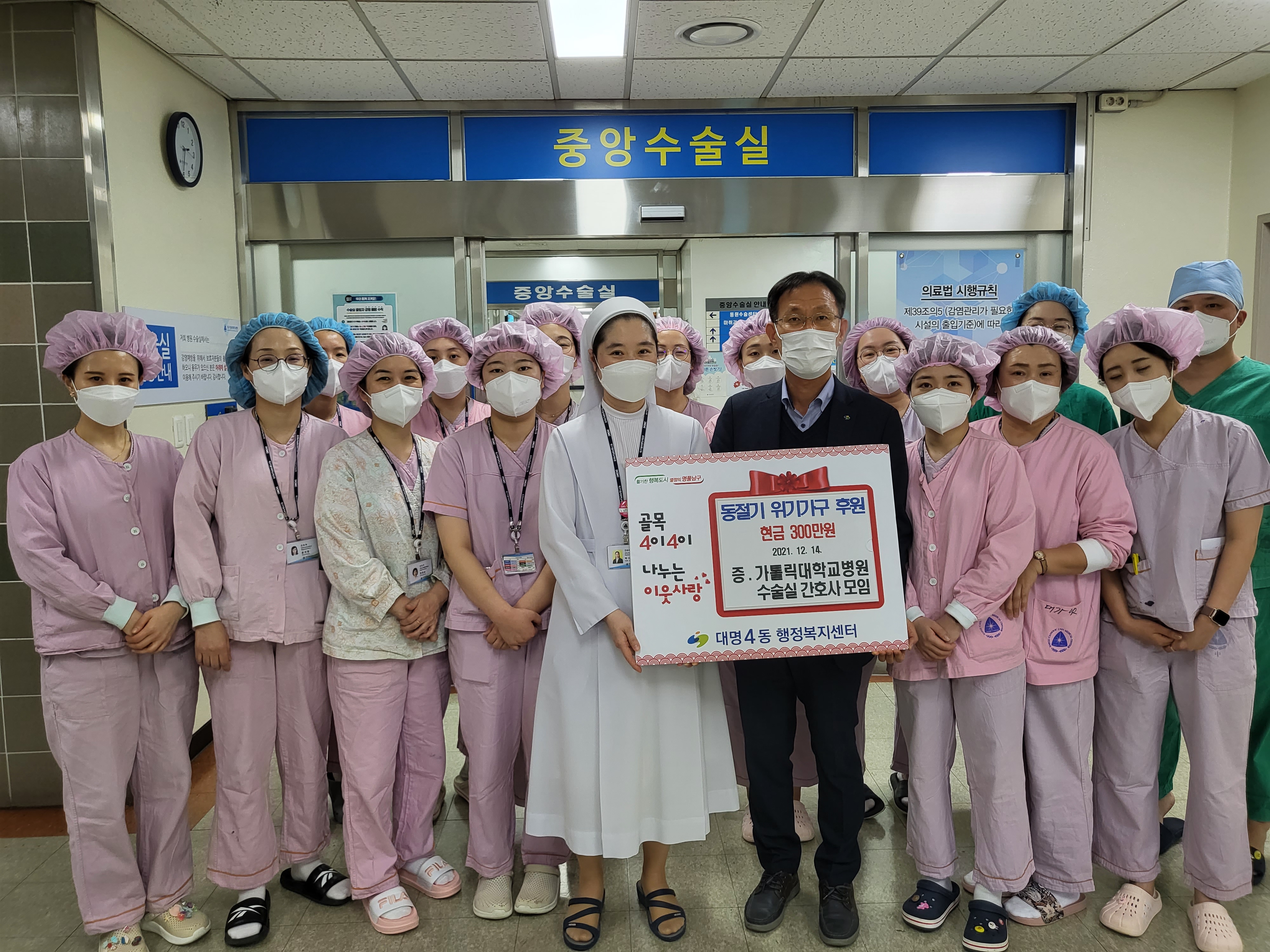 최근 수술실 간호사 모임은 이번 동절기에 어려움을 겪고 있을 지역민들을 돕고자 대명 4동 행정복지센터를 통해 의료복지 사각지대에 놓인 대상자를 발굴하여 300만원 기부를 약속했다. 이에 지난 14일(화) 대구가톨릭대학교병원 수술실 입구에서 박지현 수술간호팀장 및 대명 4동 행정복지센터 관계자, 수술실 간호사 등이 모인 가운데 기부가 진행되었다.