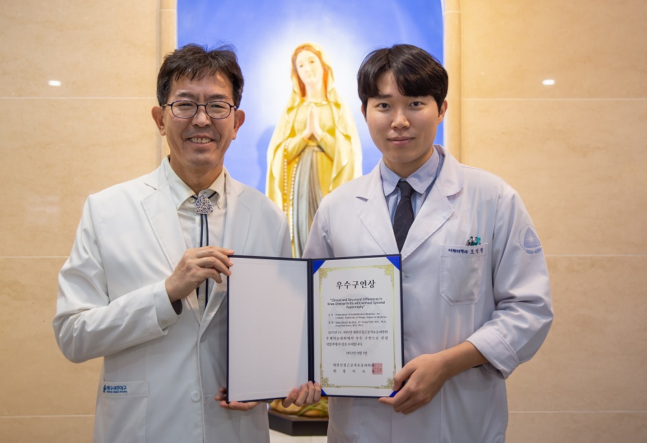 재활의학과 박기영 교수팀(재활의학과 박기영·권동락 교수·조성철 전공의(3년차))이 지난 11월 5일(토) 서울대학교(관악캠퍼스) 글로벌공학교육센터 대강당에서 개최된 2022년 대한신경근골격초음파학회 추계학술대회에서 ‘무릎 관절염 환자에서 활막 비후 유무에 따른 임상적, 구조적 차이’라는 연구 논문을 구연 발표해 ‘우수구연상’을 수상했다.