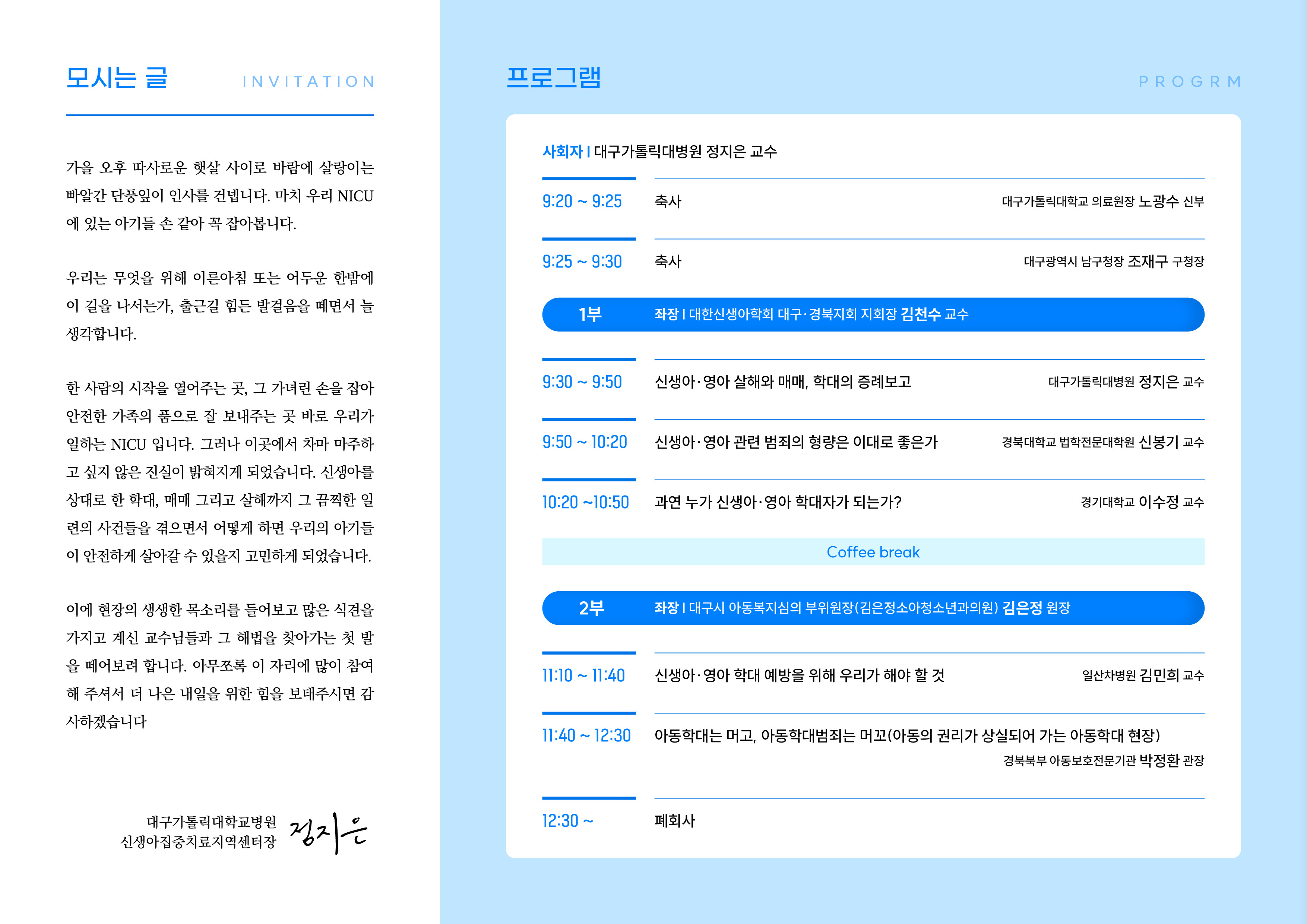 세미나 프로그램은 크게 2부로 나뉜다. 1부는 대한신생아학회 대구·경북지회장 김천수 교수가 좌장을 맡는다. 연자로 ▲대구가톨릭대학교병원 정지은 교수(신생아·영아 살해와 매매, 학대의 증례보고) ▲경북대학교 법학전문대학원 신봉기 교수(신생아·영아 관련 범죄의 형량은 이대로 좋은가) ▲경기대학교 이수정 교수(과연 누가 신생아·영아 학대자가 되는가?)가 참여해 각각 발표한다.