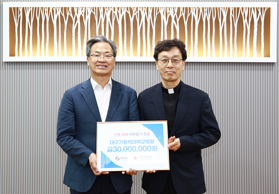 우리병원은 5월 28일(수) 영양군청에서 김병수 행정처장과 오도창 영양군수 등 관계자들이 참석한 가운데 최근 대규모 산불로 큰 피해를 입은 경북 영양군 주민들을 위해 3천만원을 기부했다. 이번 산불은 수일간 강풍을 타고 번지며 영양군 일대의 산림과 주택, 농업시설에 큰 피해를 입혔고, 수십여 명의 이재민이 삶의 터전을 잃는 등 지역사회가 큰 충격에 빠졌다. 이에 대구가톨릭대학교병원은 사회적 책임을 다하는 의료기관으로서 지역사회와의 연대를 바탕으로 실질적인 도움을 전하고자 기부를 결정했다. 김병수 행정처장은 전달식에서 “영양군은 대구가톨릭대학교병원이 다양한 의료사업을 통해 꾸준히 인연을 맺어온 지역으로, 이번 산불 피해 소식을 듣고 마음이 매우 아팠다”며, “작은 정성이지만 주민 여러분께 위로가 되고, 빠른 일상 회복에 도움이 되기를 바란다”고 말했다. 오도창 영양군수는 “예기치 못한 자연재해로 많은 주민이 어려움에 처한 상황에서 대구가톨릭대학교병원의 도움은 큰 희망이 된다”며, “기부금은 피해 복구와 이재민 지원에 신속하고 투명하게 사용하겠다”고 감사의 뜻을 전했다.
