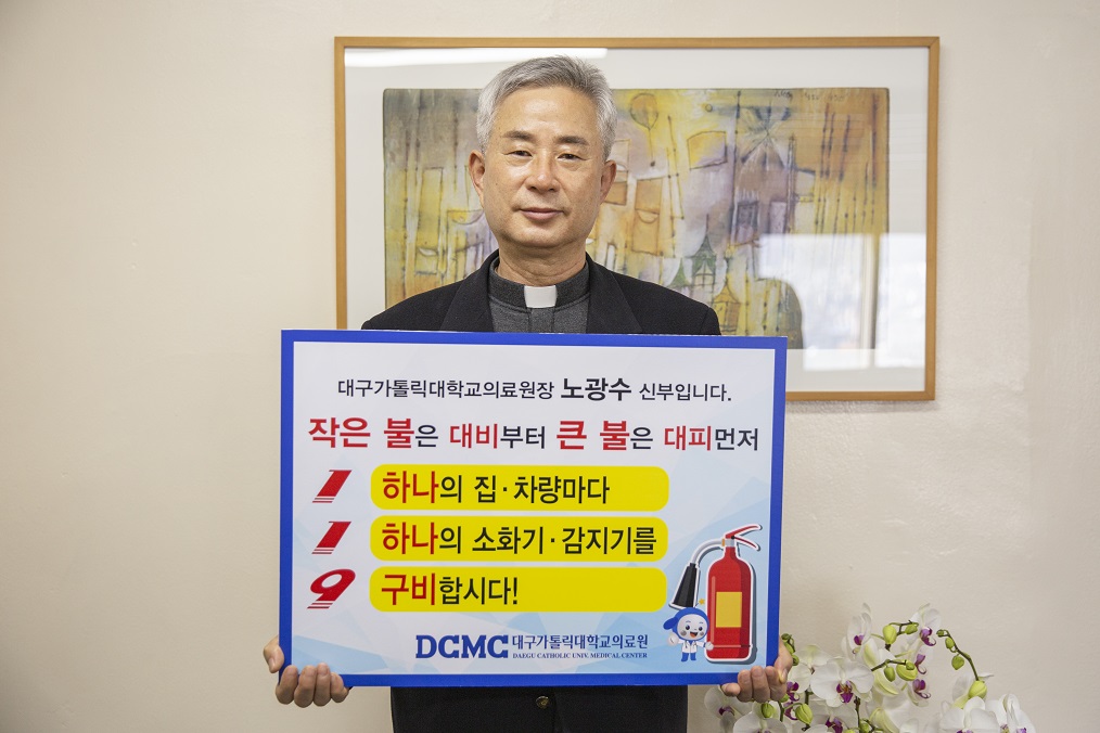 신기선 대구 중부소방서장의 지목을 받아 챌린지에 참여한 노광수 의료원장은 “작은 불은 대비부터 큰불은 대피먼저!”, “1(하나의 집·차량마다) 1(하나의 소화기·감지기를) 9(구비합시다)” 표어 팻말과 함께 찍은 사진을 4월 1일(목) 대구가톨릭대학교의료원 공식 SNS에 공유하고 다음 챌린지 주자로 우동기 대구가톨릭대학교총장, 이상재 대구가톨릭평화방송사장을 지목했다.