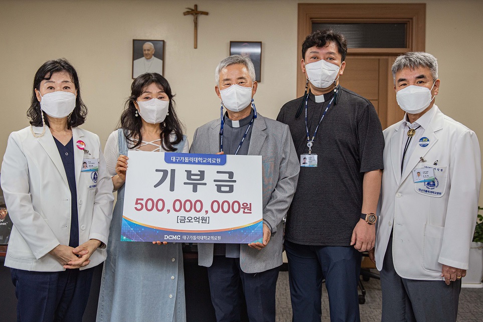 대구가톨릭대학교의료원은 지난 8월 27일(금) 한 부녀 기부자로부터 5억원을 전달받았다. 이날 아버지는 참석하지 못했지만 그 마음을 함께 담아 기부한 딸은 취약계층 의료지원을 위해 사용해줄 것을 전했다. 노광수 의료원장을 비롯하여 김숙영 의과대학장, 이창형 병원장, 배상희 행정처장은 한 목소리로 기부자들에게 감사의 뜻을 전했다. 아울러 노광수 의료원장은 “질병으로 고통받은 의료 취약계층들의 어려움이 해소 될수 있도록 소중히 사용하겠다.”며 “또한, 기부자의 사랑이 잘 전해질수 있도록 하겠다.”고 전했다. |