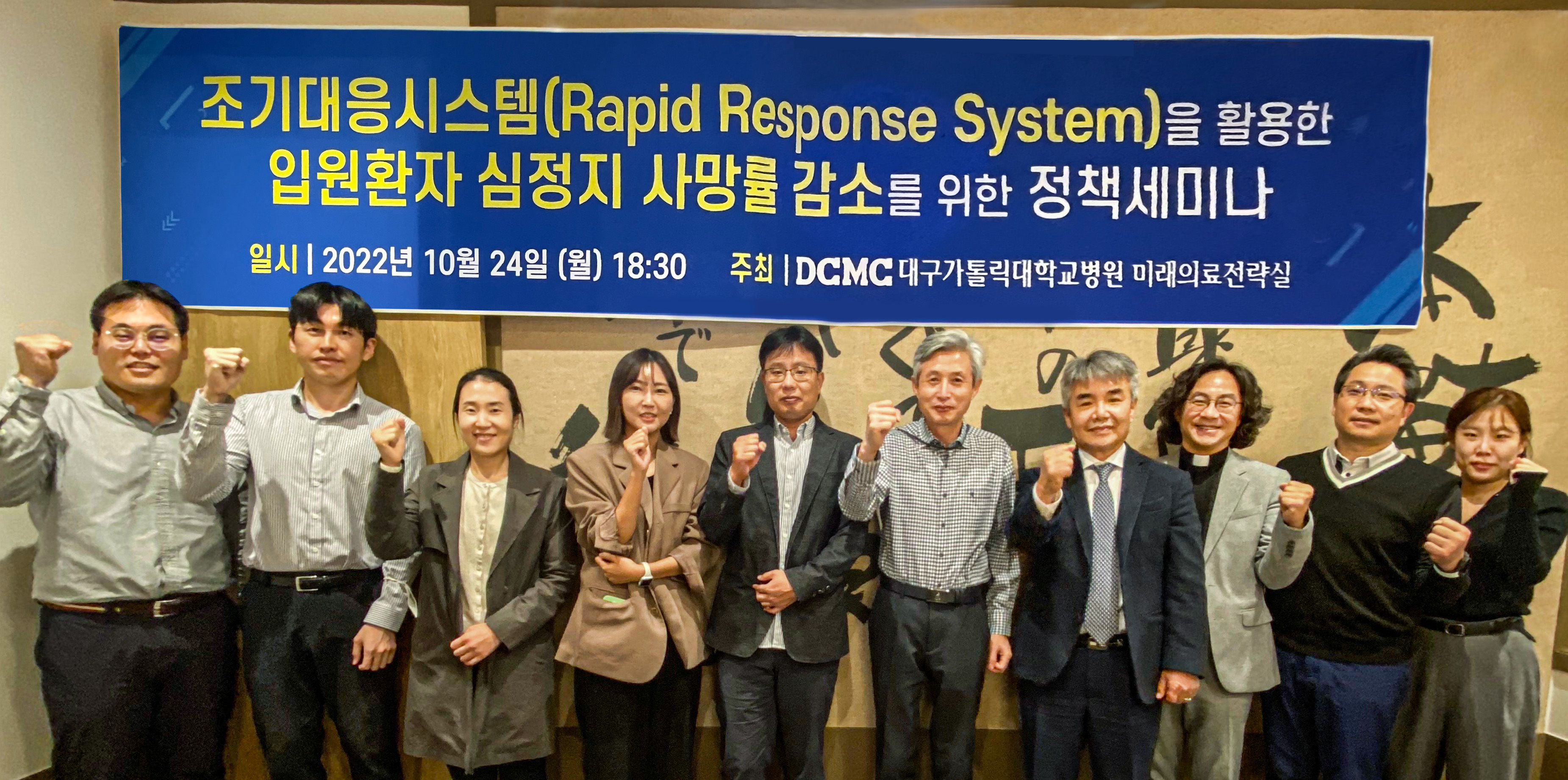 '조기대응시스템 활용 입원환자 심정지 사망률 감소 위한 정책 세미나’ 성료 대구가톨릭대학교병원 미래의료전략실이 주관한 ‘조기대응시스템(Rapid Response System)을 활용한 입원환자 심정지 사망률 감소를 위한 정책세미나’가 10월 24일(월) 진행됐다. 이날 세미나에는 이창형 병원장, 미래의료전략실장 송석영 교수, 신속대응팀장 박기성 교수 등 병원 관계자 10명이 참석했다. 대구가톨릭대학교병원은 지난 9월부터 심정지 발생 위험 감시 AI 의료기기인 ‘DeepCARS System’ 데모를 도입하여 운영중이다. DeepCARS는 입원환자의 24시간 이내 심정지 발생 위험 감시를 목적으로 환자의 4가지 활력징후를 기반한 딥러닝 기술을 활용해 심정지 발생 위험도를 제공한다. 이에 미래의료전략실과 신속대응팀은 이번 정책 세미나를 통해 DeepCARS의 데모버전에 대한 평가를 발표하였다. 또한, 대구가톨릭대학교병원은 현재 심정지 예측을 위한 인공지능 모델을 개발중이다. 이는 EMR에 저장되어 있는 환자 데이터에 AI 알고리즘을 적용한 근거 중심 예측모델로써 환자 개인별 맞춤식 위험인자 확보가 가능한 시스템이다. 송석영 미래의료전략실장은 “임상현장에서 가장 많이 사용되는 조기경보점수(NEWS score)는 예측에 대한 정확도가 비교적 낮은 편인데 이와 함께 DeepCARS와 심정지 예측 인공지능 모델까지 동시 운용한다면 심정지 예측 및 환자 상태 파악에 대한 정확도 향상과 입원환자 안전을 위한 모니터링 등 환자 생존율 제고에 이점으로 작용할 수 있다.”고 전했다. 이창형 병원장은 “환자의 소중한 생명을 지키는 의료기관으로써 시스템이 잘 정착할 수 있도록 많은 관심과 노력을 기울이겠다. 더불어 입원환자 심정지 사망률 감소에 효과적인 역할을 기대한다.”고 말했다. |